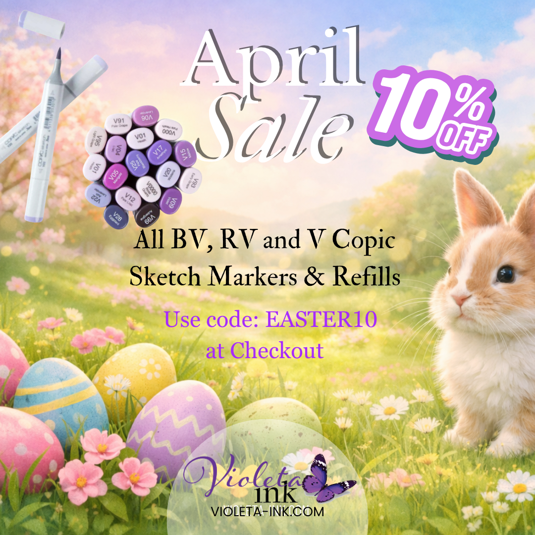 In the Month of April save 10% on ALL BV, RV and V Copic Markers and Refills! USE the code EASTER10 at check out. Don’t forget to tell a friend.